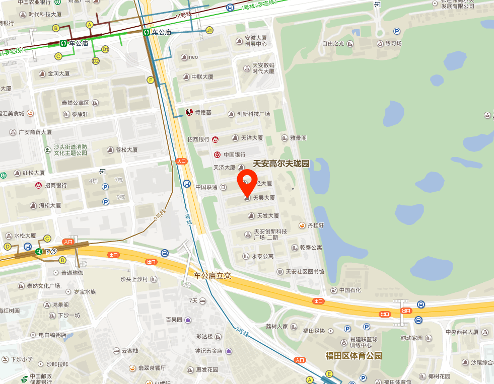 附近的地铁站: 距离地铁1、7、9、11号线的换乘站--车公庙站约730米 附近的公交站: 天安数码城 - 公交站355米; 途经公交车: 26路 63路 64路 71路 215路 303路 E12路 E1路 E37路 E6路 H220路 M102路 M169路 M500路 M555路 M559路 高快巴士14号 高快巴士16路 高快巴士70路 上沙 - 公交站471米;途经公交车: 34路 229路 337路 M182路 M463路 M559路 下沙① - 公交站540米; 途经公交车: 63路 236路 369路 E37路 E6路 M105路 M106路 M133路 M194路 福田欢乐购免费接驳专线1路 高快巴士14号 高快巴士16路 高快巴士70路 下沙① - 公交站548米; 途经公交车: 26路 63路 64路 322路 337路 339路 369路 E37路 E6路 M103路 M182路 M194路 M347路 M463路 M519路 M520路 福田欢乐购免费接驳专线1路 高快巴士14号 高快巴士16路 深南香蜜立交② - 公交站679米;途经公交车: 101路 N6路 深南香蜜立交① - 公交站681米; 途经公交车: 21路 101路 113路 215路 222路 223路 324路 326路 328路 E38路 H220路 M191路 M213路 M392路 M413路 M447路 M447区间线 M448路 N4路 N6路 东站春运专线1号 高峰专线119路 高峰专线16号 高峰专线18路 高峰专线221号 高峰专线3号 高峰专线49路 高峰专线62路 高快巴士31路 高快巴士47号 高快巴士60号 上沙村② - 公交站733米;途经公交车: 26路 71路 215路 303路 362路 M102路 M169路 M500路 M519路